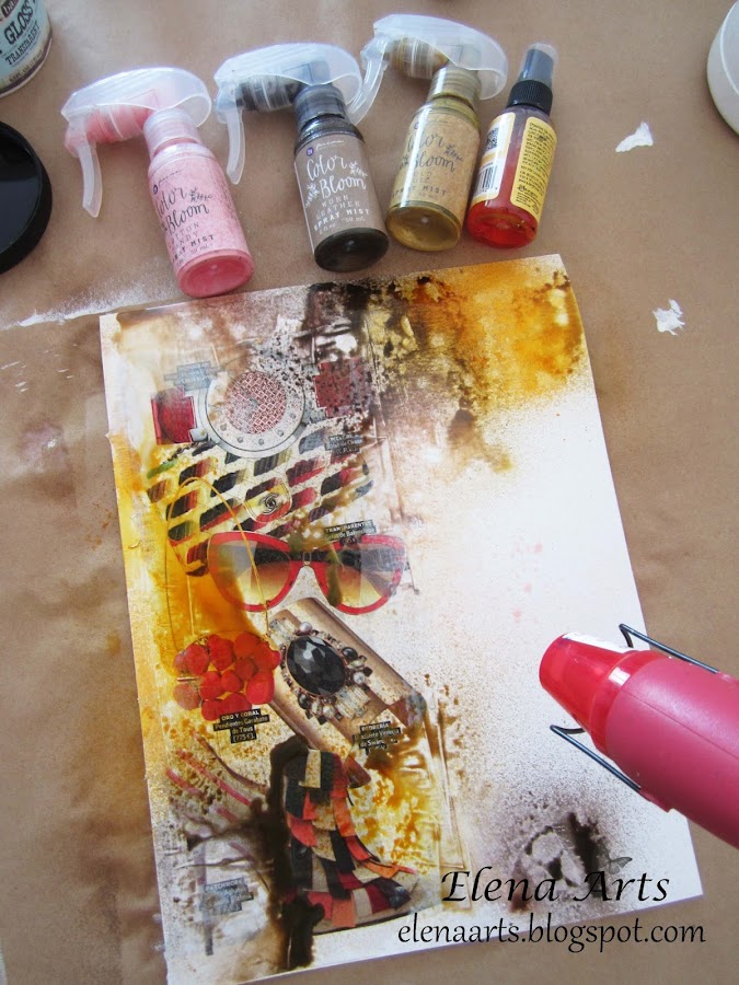 Después añadí unos cuantos colores en spray "Color Bloom", últimamente son mis preferidos :). Lo sequé todo bien antes de aplicar la siguiente capa.