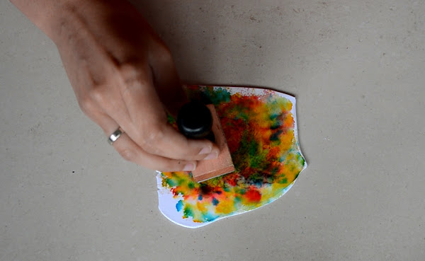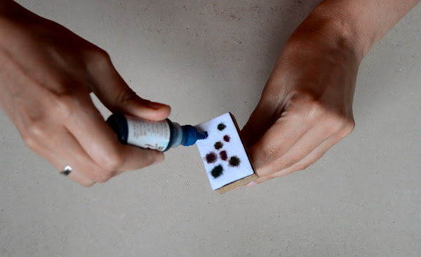Pegamos el fieltro en el aplicador y vertemos algunas gotas de diferentes colores de tintas al alcohol. Con un par de gotas de cada color es suficiente.