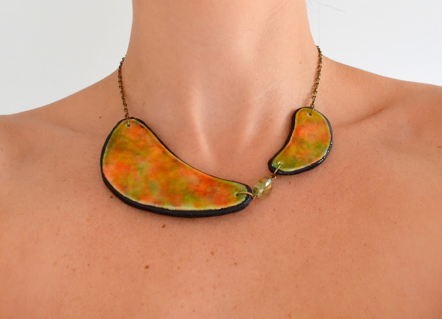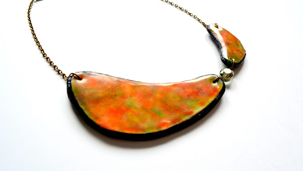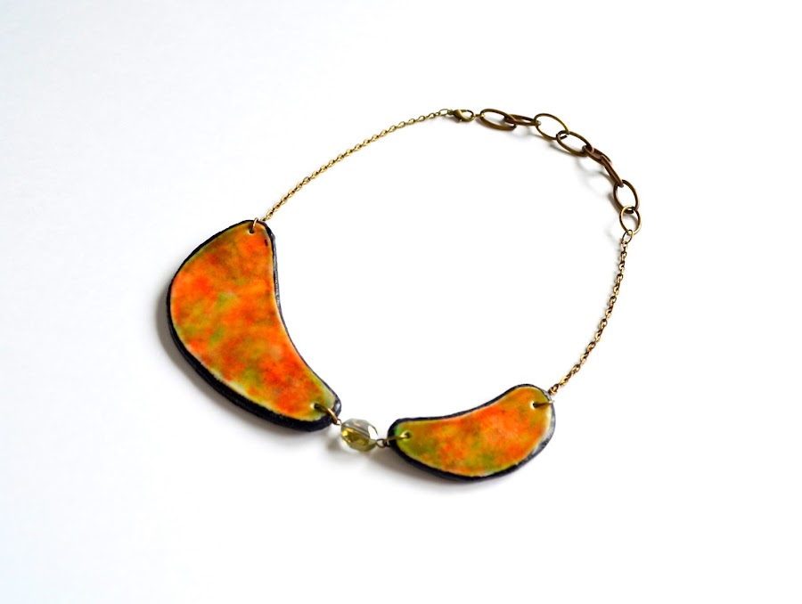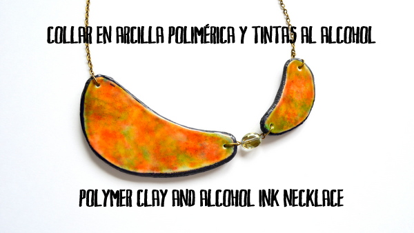 Me gustan mucho los colores que quedaron, que con esta técnica son totalmente aleatorios, y también las formas orgánicas que conforman el collar. Lo monté con una cadena en color oro viejo a la que añadí un trozo de cadena bastante más grueso que, además de proporcionar un detalle interesante, hace que el largo sea ajustable. Son esas cosas que surgen por casualidad porque no tenía suficiente cadena para hacer el collar entero...
