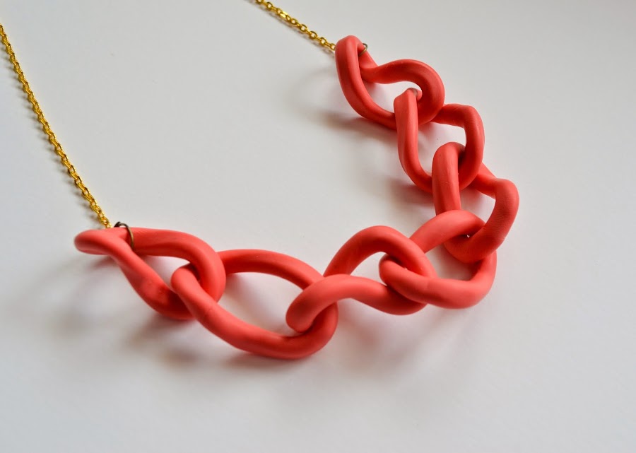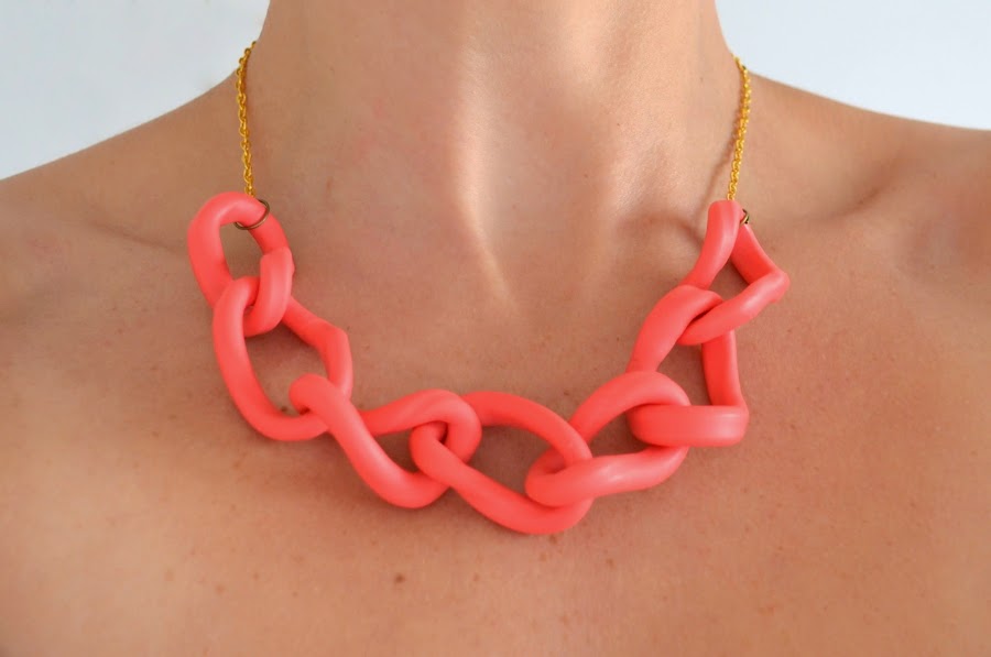 La pieza que vamos a hacer es este collar de eslabones grandes, que está tan en tendencia. Y si además lo hacemos en un color tan veraniego como este coral, o en colores pastel, nos quedará genial con cualquier conjuntito veraniego.
