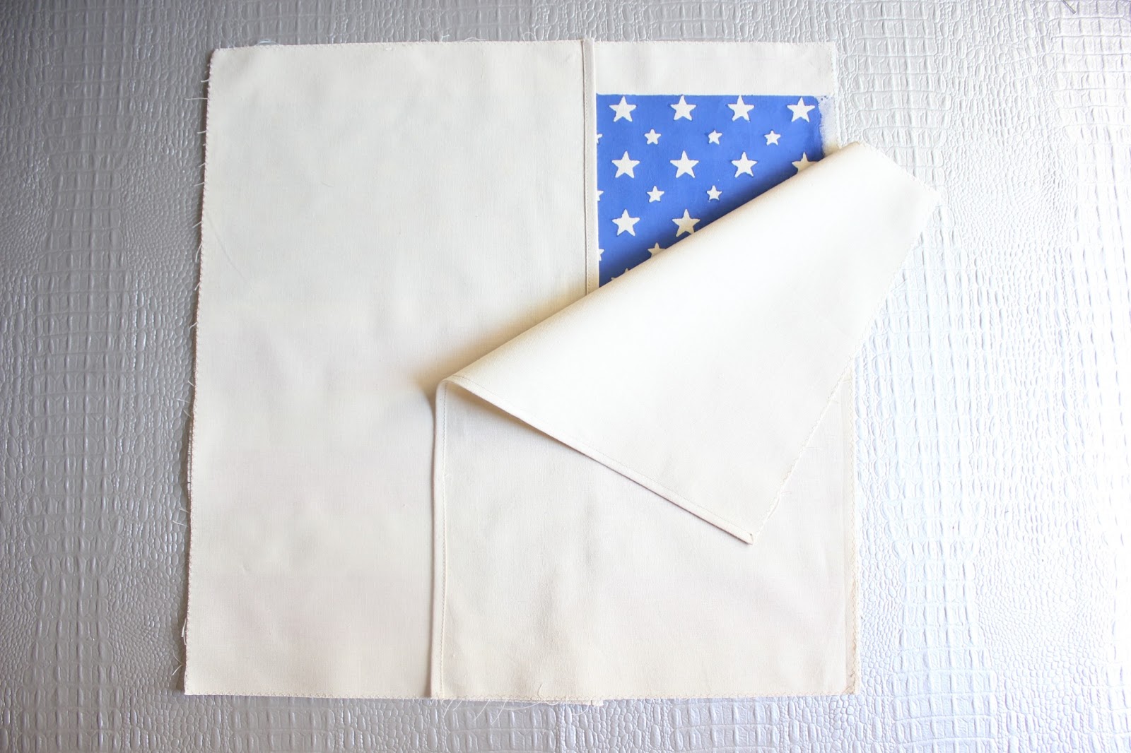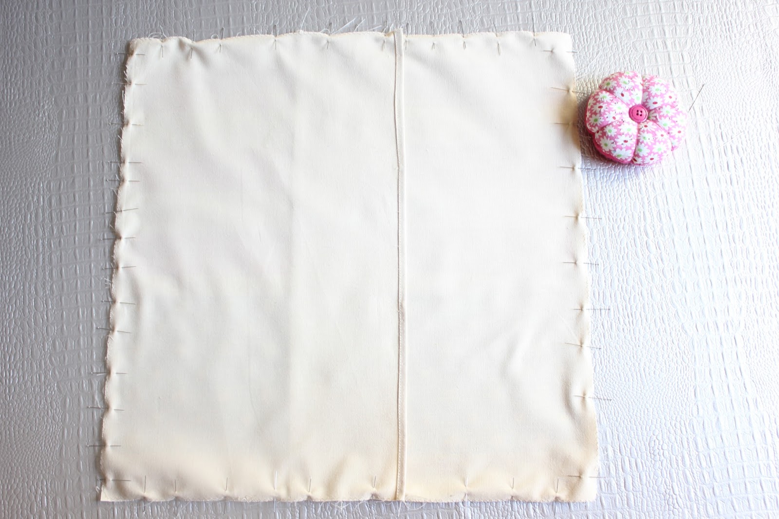 ♥ Ahora que tenemos todas nuestras telas preparadas, vamos a enfrentar los derechos: colocamos un rectángulo (con el derecho hacia abajo y el dobladillo hacia fuera) encima del cuadrado y el segundo rectángulo por encima del primer rectángulo (también, con el derecho hacia abajo y el dobladillo hacia fuera).