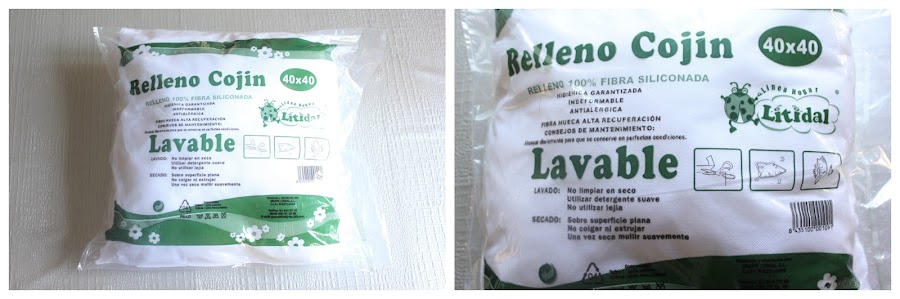 Esta funda es para un relleno de cojín de 15,75 x 15,75 pulgadas (40 x 40 cm). El mío, lo compré en una tienda de chinos por un par de euros.