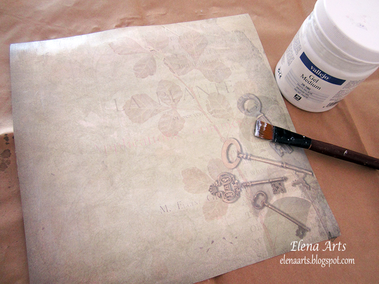 Vamos a empezar con cubrir la superficie de papel con un gel médium transparente. Lo podemos sustituir por un gesso transparente o incluso de color blanco. Aplicaremos una fina capa del producto y dejaremos que se seque por completo.