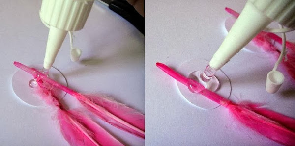 8. Con la silicona pegamos dos plumas en el circulo grande y una pluma en el circulo pequeño.