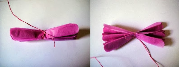 2. Los doblamos en abanico, con un grosor de un centímetro más o menos y los atamos con un cordón de rafia por el centro.