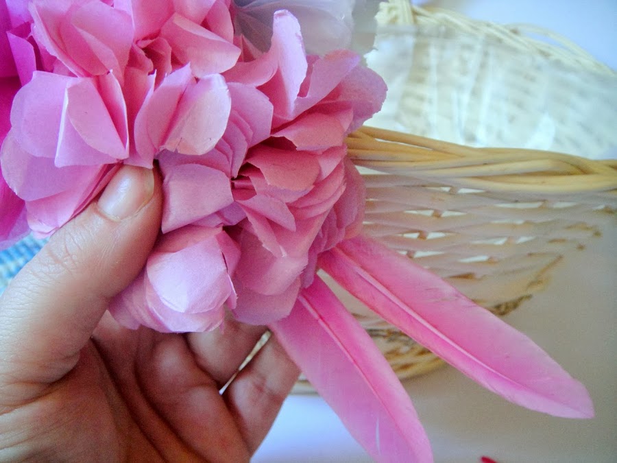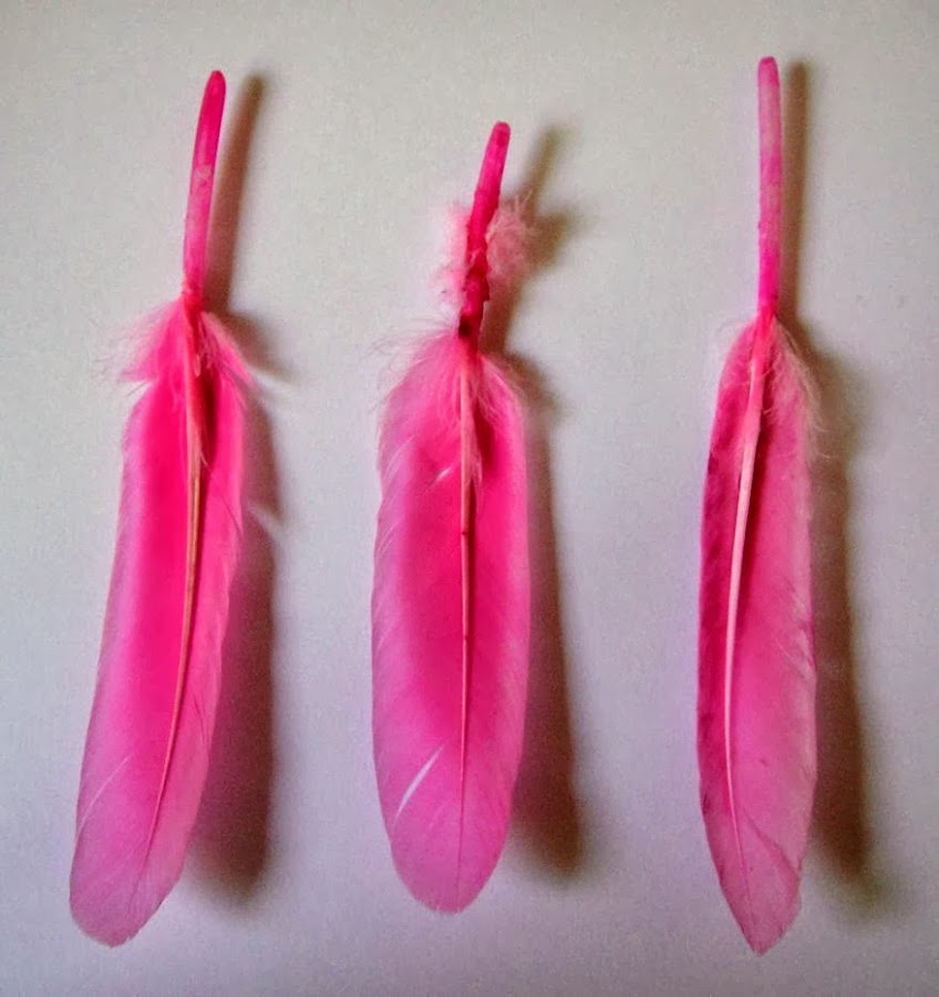 9. Y ahora pegamos las plumas detrás de los pompones, las dos que van juntas abajo y la otra pluma en la parte de arriba como se ve en las fotos.