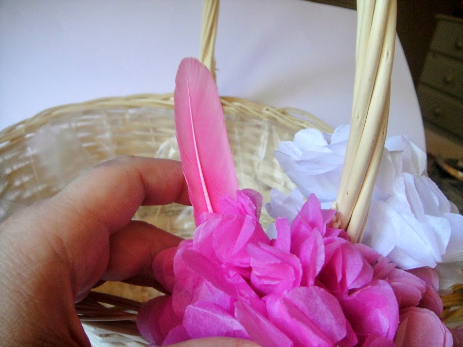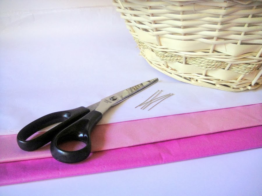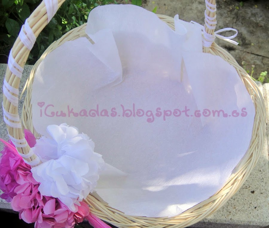 12. Y ya tenemos la cesta decorada. Lo normal es que las cestas vengan con el fondo plastificado o no tengan nada, por eso con un poco de papel seda cortado más o menos al tamaño de la cesta le hacemos el fondo.