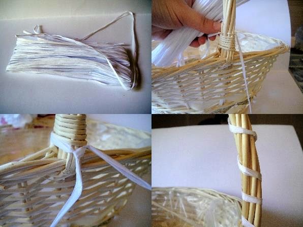 10. Ahora con el rollo de rafia entero, la atamos al asa de la cesta, por el lado contrario al de los pompones, y dejamos un poco de cordón de margen. Vamos liando la rafia en espiral alrededor de el asa de la cesta hasta llegar al lado de los pompones, y allí la atamos y cortamos. Volvemos a hacer lo mismo de nuevo, dejando un poco de rafia de margen, para hacer doble la rafia y que se vea un poco más.