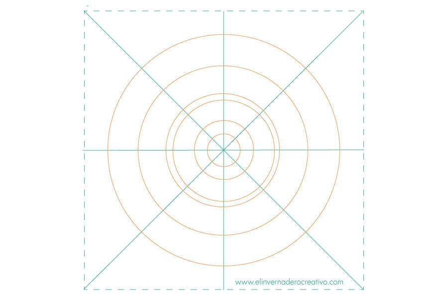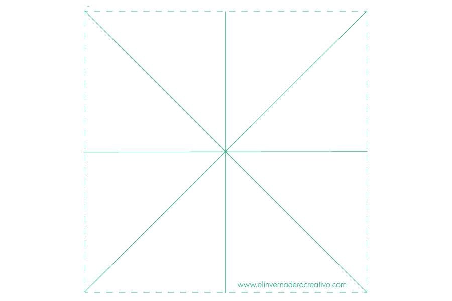 El primer paso será dividir nuestro soporte en un cuadrado imaginario (Si te ayuda, puedes dibujar el cuadrado). Dividiremos el cuadrado en cuatro partes iguales y realizaremos las diagonales desde el centro de la cruz que ha surgido.