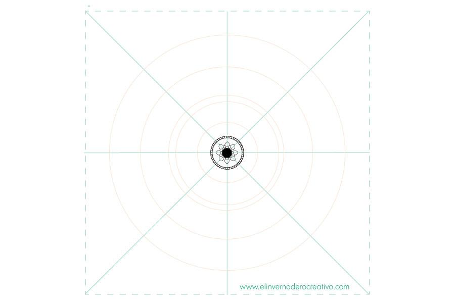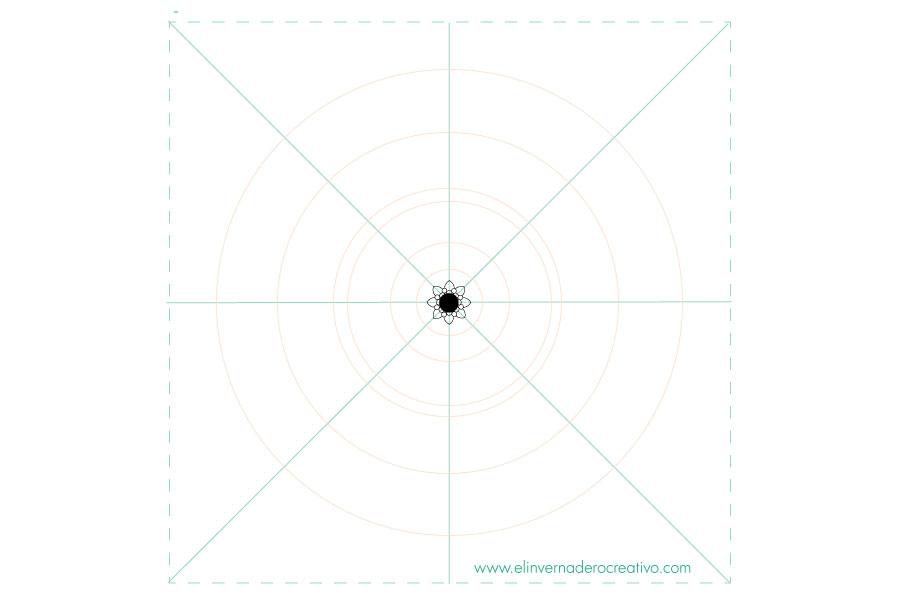 Continuamos con varios pétalos siguiendo las diagonales marcadas. Para ello marcamos el inicio del pétalo en el punto intermedio entre dos diagonales. Completamos el pétalo con círculos de varios tamaños.