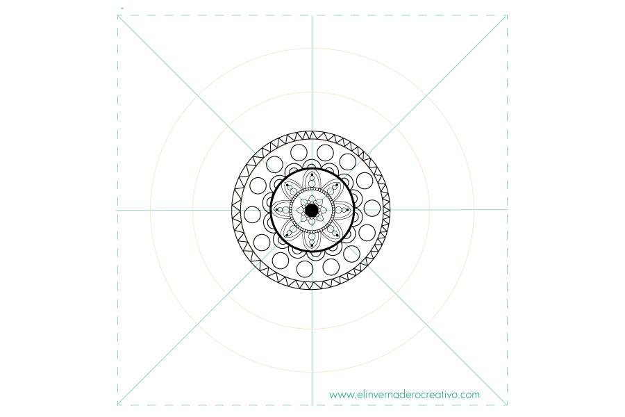 Ya tenemos la base, ahora empieza lo mejor, vamos a rellenar el mándala. Para realizar este tutorial e tomado como ejemplo algunas figuras geométricas recurrentes, puedes copiarlas para realizar el primero. Poco a poco irás descubriendo nuevas formas con las que rellenar el mándala y conseguir un resultado espectacular. (Click sobre la imagen para aumentar)