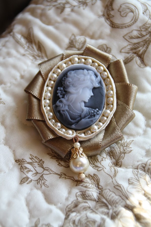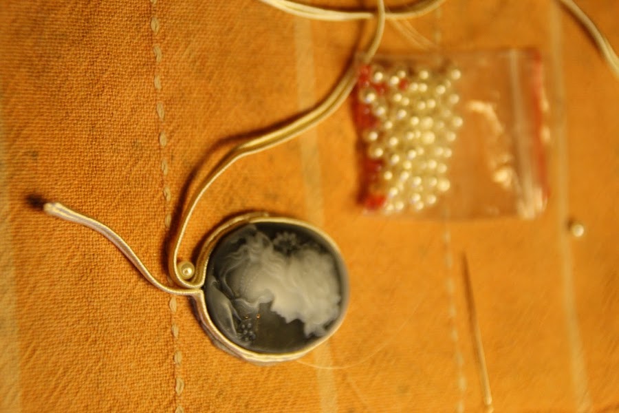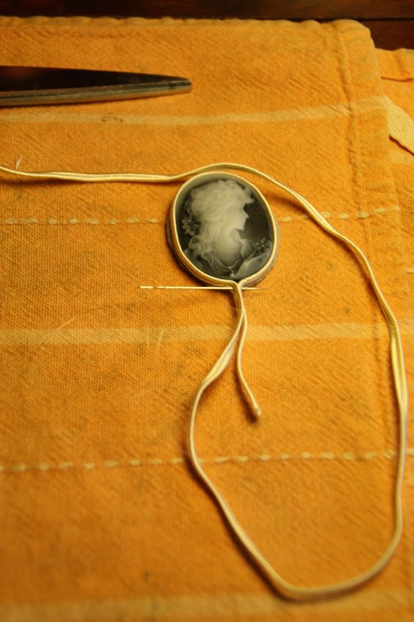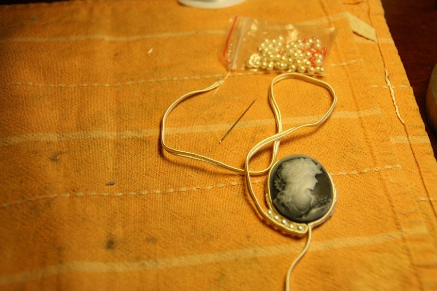 El siguente paso, como podéis observar, es ir COSIENDO alrededor del camafeo las perlitas; la idea es: cinta-perla-cinta (las perlas quedan en medio de dos cintas de soutage).