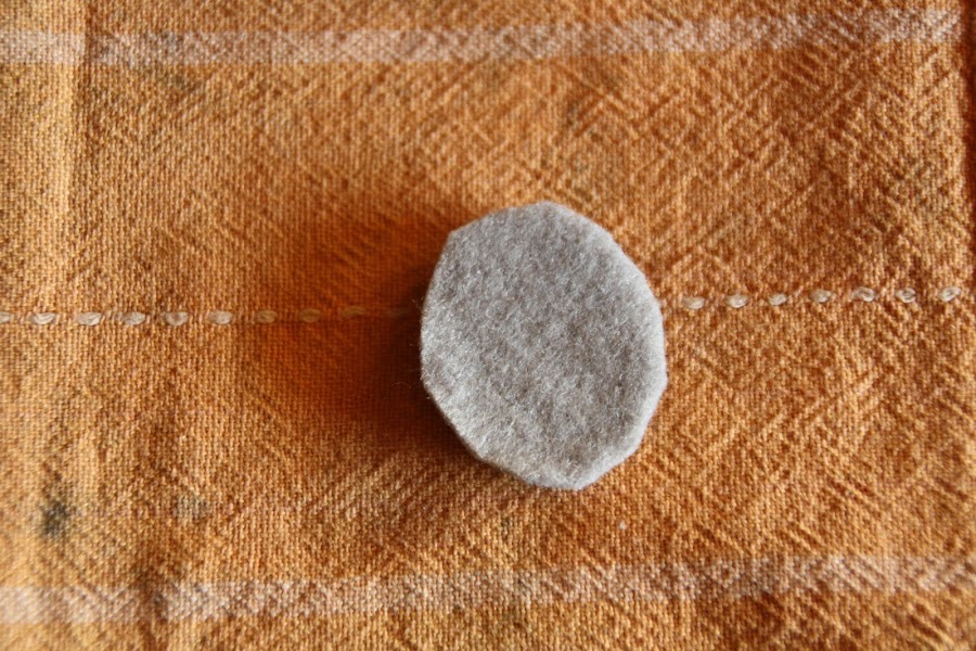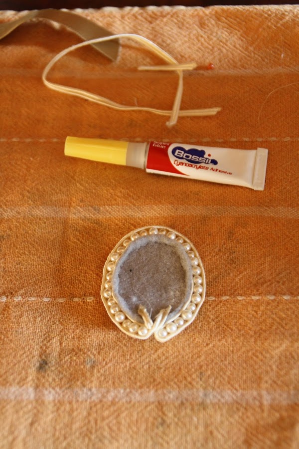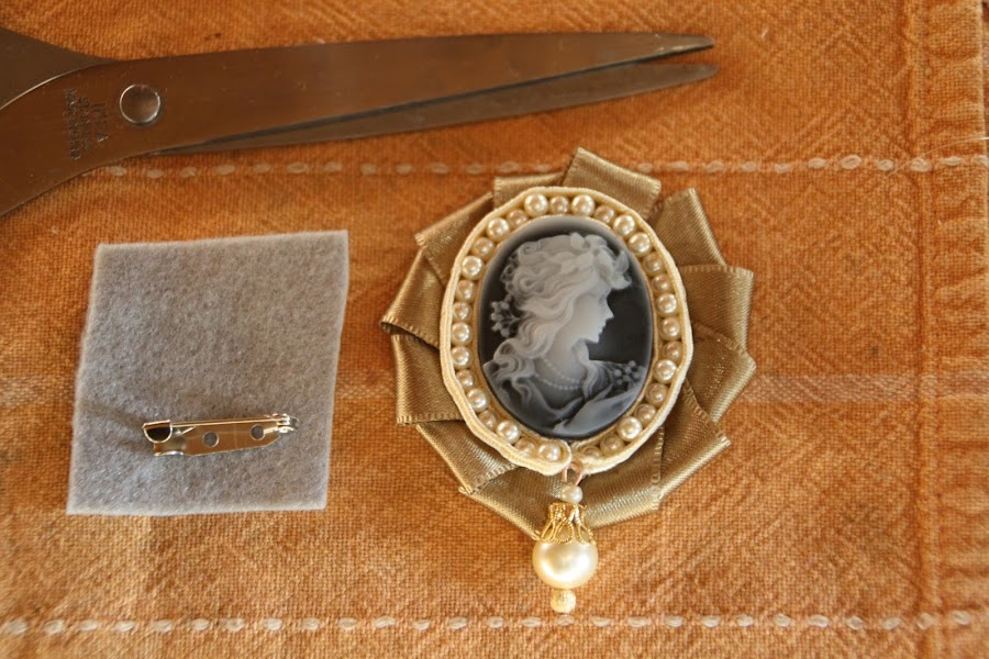 Iniciamos el trabajo PEGANDO al dorso del camafeo un trozo de fieltro, como se ve en las fotos. No cortéis el material demasiado a ras del camafeo; que quede un poco saliendo por los bordes.