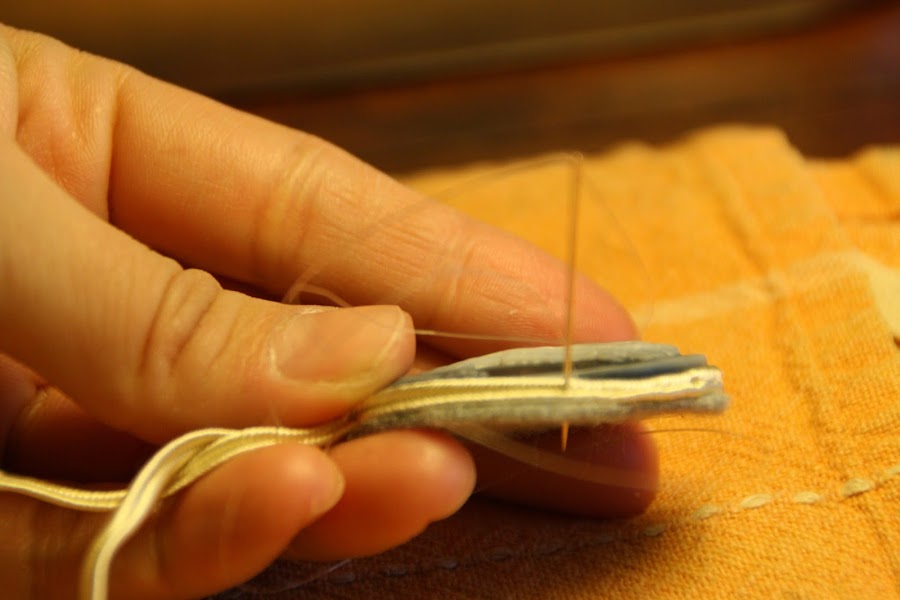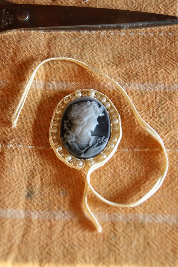 La idea siguiente consiste en COSER la cinta de soutage alrededor del camafeo. Empezamos asegurándola con una puntada donde se juntan los dos cabos como se ve en la foto. Luego, cosemos poco a poco con el hilo de pescar, uniendo la tira al fieltro que sobresale. Se puede pegar en vez de coser, pero nunca me ha dado buenos resultados... no os lo aconsejo.