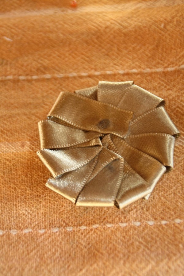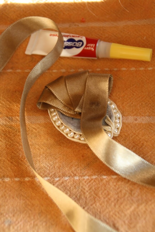 ¡Por fin dejamos de coser!! Con toda libertad (pero con cuidado de no ensuciar nada...¡y de no pegarnos los dedos!) empezamos a PEGAR la cinta de raso por la parte de atrás. Lo que deseamos es que por delante tenga el siguiente efecto: