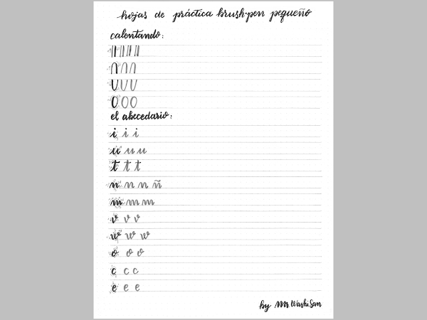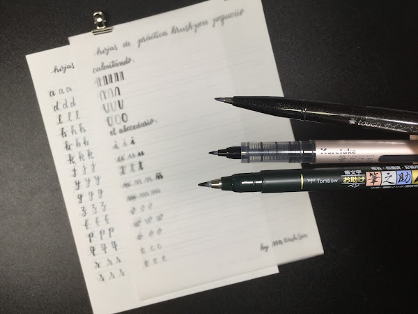 En el anterior post de mi blog tengo colgados unos archivos en formato PDF que podéis descargar de forma gratuita e imprimir tranquilamente en vuestra casa. Estos archivos contienen hojas de práctica para familiarizaros con la escritura de rotuladores pincel.
