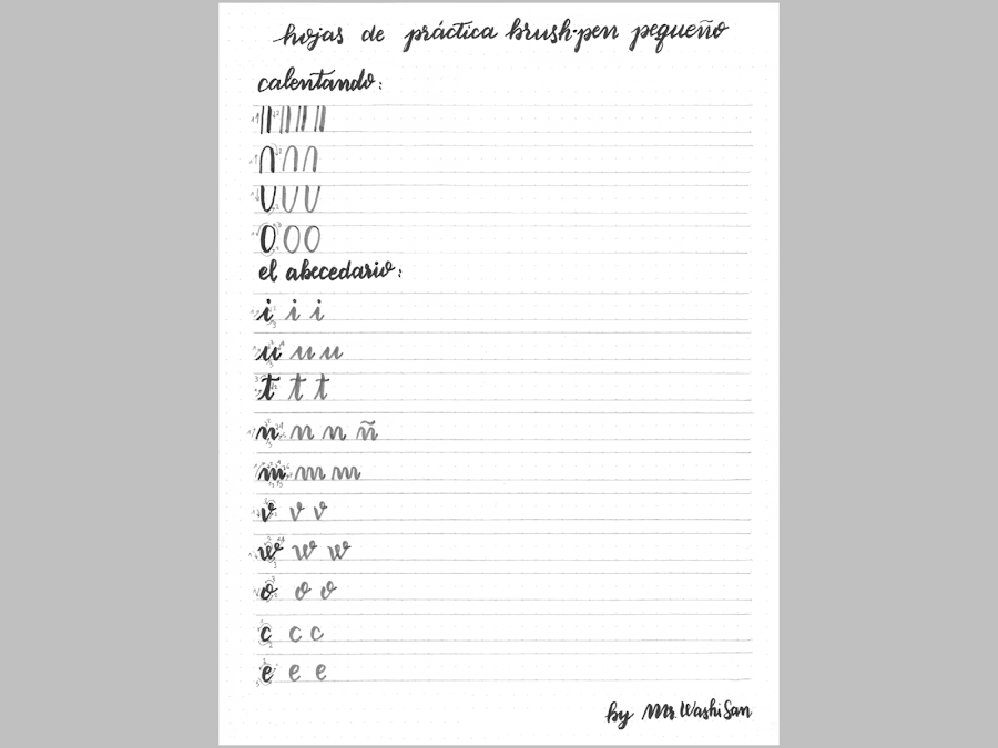 Después de este primer esquema que está en color negro, tenéis en gris repetidas dos o tres veces los trazos y las letras para poder escribir sobre ellos.
