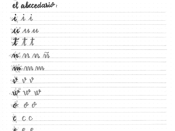 Las letras se presentan en las hojas de práctica ordenadas más o menos por dificultad y agrupadas por tipología. Primero, tenéis las letras formadas con líneas rectadas y más adelante las letras que también tienen líneas curvas. Por eso, encontráis primero letras simples como la i o la u, y las letras como la a están en la segunda parte de la hoja de práctica. La a es una letra bastante difícil ya que consta de un semicirculo más un trazo descendente, por eso no os la he puesto la primera pues es bastante habitual que la gente tenga dificultades con la a, mejor dejarla para cuando ya tengáis controlado letras más sencillas.