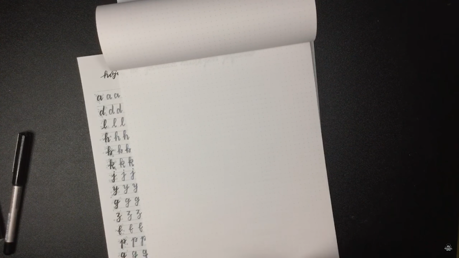 La punta de los rotuladores pincel es delicada y si el papel no es muy suave se va estropeando con el uso. Por eso, es importante cuando imprimáis los archivos PDF lo hagáis con un papel muy suave y satinado si es posible. En el listado de materiales tenéis un tipo de papel que es adecuado y no estropea los rotuladores. Otra alternativa consiste en imprimir en una hoja normal y hacer las prácticas en una hoja de papel vegetal, que es muy suave y podemos situarla encima de la hoja de práctica. Una última alternativa es utilizar un bloc de la marca Rodia que es especial para rotuladores y además tiene una cuadricula de puntos que nos ayuda a mantener la regularidad del tamaño de las letras y a mantener la línea horizontal. Es bastante fino y se transparenta la hoja de práctica, pero también podéis utilizar la hoja un poco desplazada como veis en la imagen.