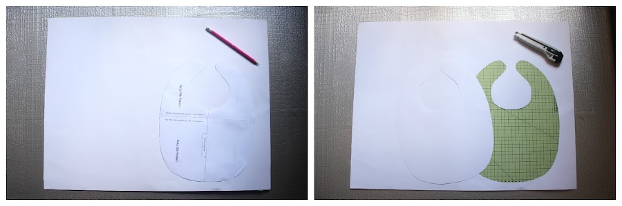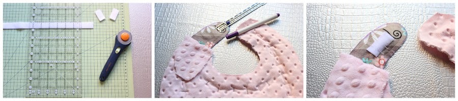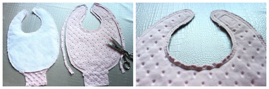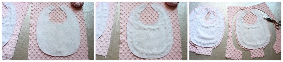 ? Cortamos alrededor de los baberos, intentando que la tela minky sea 1/2 pulgada (1,3 cm) más grande.