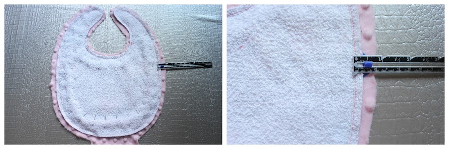Truco: en la parte baja del babero, dejamos un trozo de tela minky sin cortar para que cuando demos la vuelta a nuestra labor, nos sea más fácil doblar la tela minky y coserla.