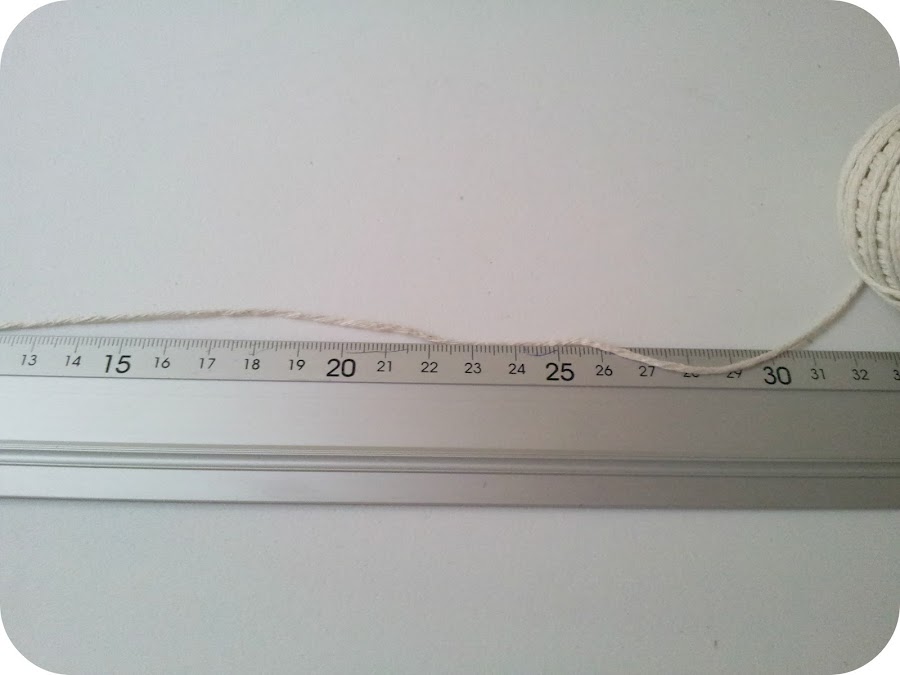 Cortamos unos 30 cm de cordón de algodón y lo introducimos por el agujero haciendo un nudo "alondra"...en la imagen lo veréis mejor. Podemos usar también nuestro Baker Twine casero.