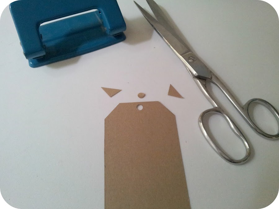 Cortamos con las tijeras sobre las marcas. Después cortamos dos de las esquinas en forma de triángulo y hacemos un boquetito central con la ayuda del boquetero.