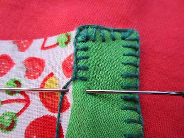 Y seguimos cosiendo el punto festón por el lado interior de la corteza. Cuidado con esta parte porque cuesta un poco más clavar la aguja, ya que hay dos telas superpuestas.