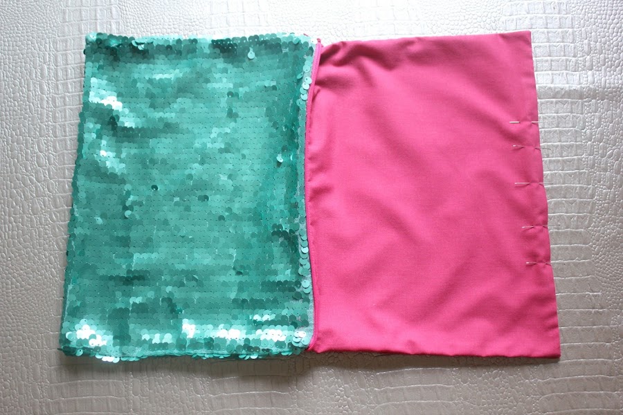 ♥ Con la cremallera medio abierta, enfrentamos los derechos de las telas de lentejuelas y los derechos de las telas interiores y sujetamos con alfileres.