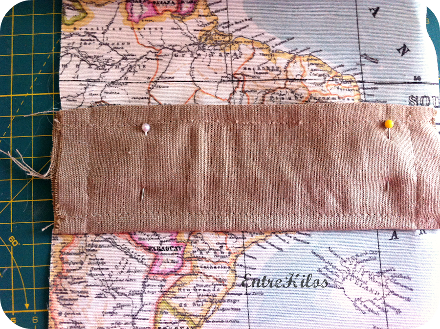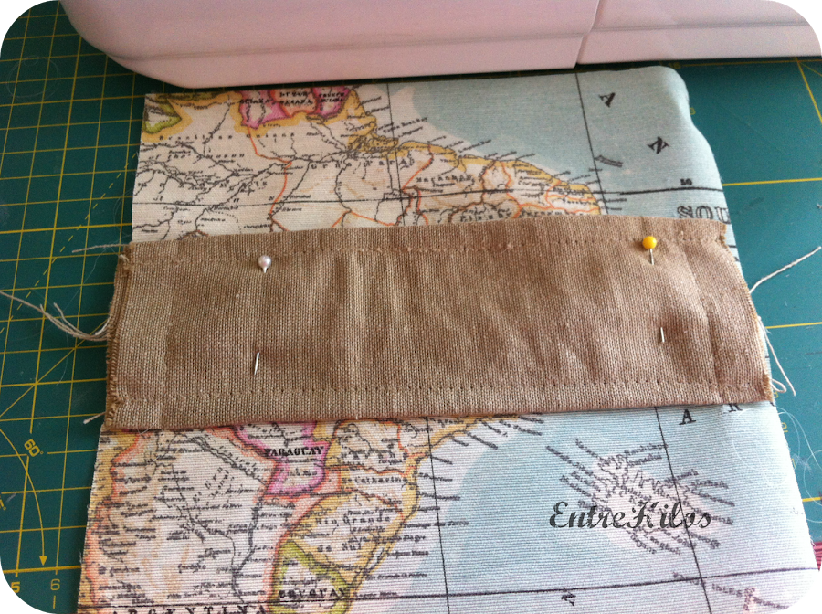 Y ahora, la sujetamos con alfileres por el derecho del trozo de la base que va a ir arriba,