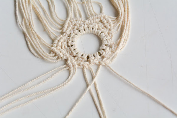 Lo siguiente es hacer un nudo plano entre cada cuatro cuerdas. En total nos quedan 10 nudos planos repartidos alrededor del anillo.