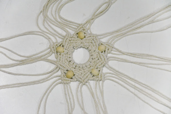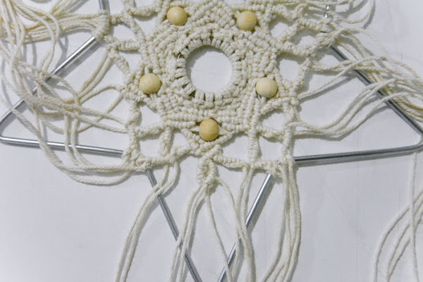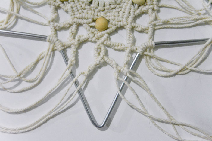 Como veis, yo he cogido las cuerdas de cada lado de la cuenta y he dejado libres las dos de en medio. Con esto ya más o menos me queda del tamaño justo para sujetarla a la estrella de metal. He echo otra tanda de 6 nudos más con las cuerdas de la punta y luego, cada una, la atamos a la barra de metal con otro nudo de festón doble como si fuera una cuerda.