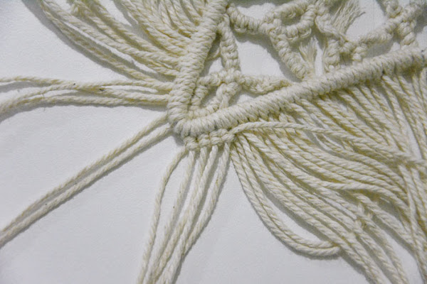 Una vez acabado el diseño, nos toca rellenar los huecos de metal que nos han quedado entre las cuerdas. Es cuestión de cortar trocitos pequeños de cuerda e ir atándolos con un nudo de alondra. Yo he aprovechado también las hebras que me habían quedado más largas de la estrella para ésto.