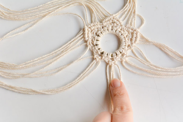 Lo primero de todo que vamos a hacer es cortar 20 cuerdas de 70-80cm de largo cada una. Si vuestra estrellita es de otro tamaño, una forma de calcular la longitud es medir más o menos la distancia que hay entre la anilla central y el pico interior de la estrella de metal, que es donde los vamos a terminar, y multiplicarlo por 6 u 8.Atamos todas las cuerdas a la anilla central, que nos va a servir de base, doblando por la mitad cada hebra y haciendo un nudo de alondra.