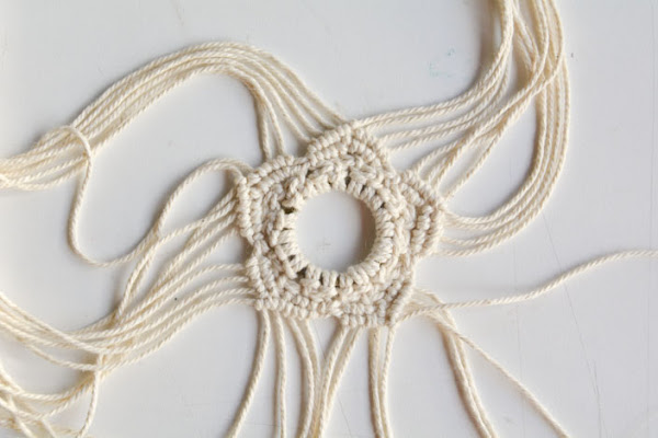 Ya casi lo tenemos listo. Tenemos cortar una nueva cuerda muy larga, de unas 5 o 6 veces el perímetro de la estrella. Con esta cuerda vamos a ir haciendo un nudo doble de festón en cada una de las cuerdas que tenemos alrededor de a estrella. Si veis que os quedan demasiado juntos, podéis hacerlo uniendo dos cuerdas a la vez.