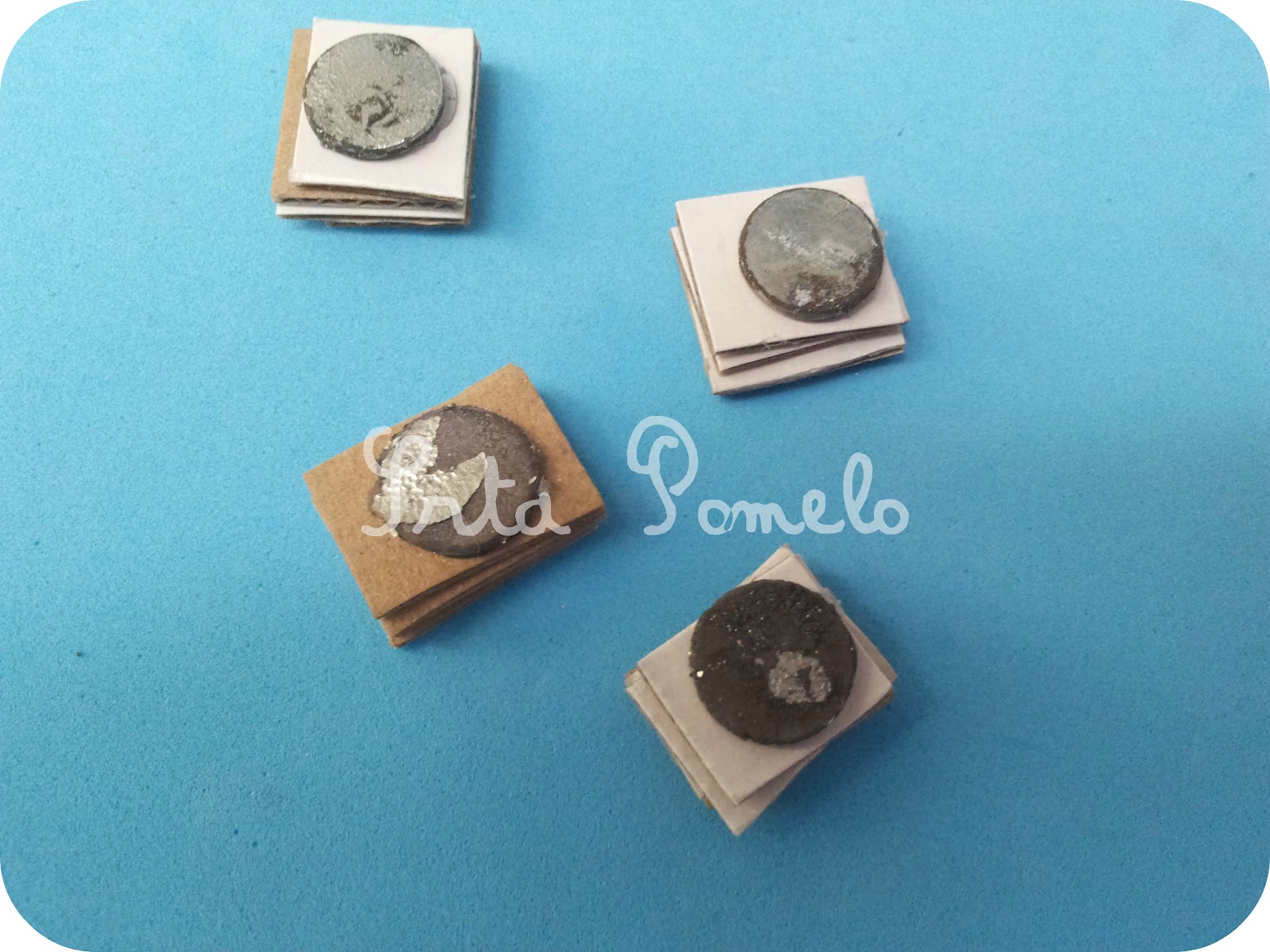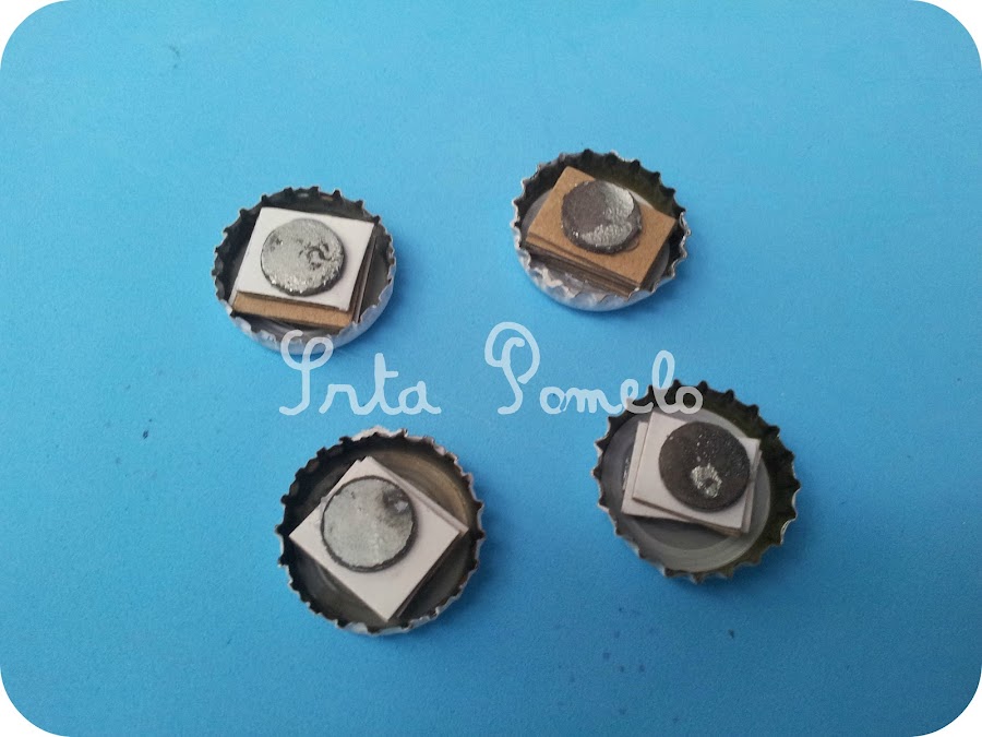 Para pegar el imán en cada chapa, he recortado unos trocitos de cartón y con la silicona caliente los he pegado en montoncitos de 4. Encima he pegado el imán y el total lo he pegado en la chapa por detrás.