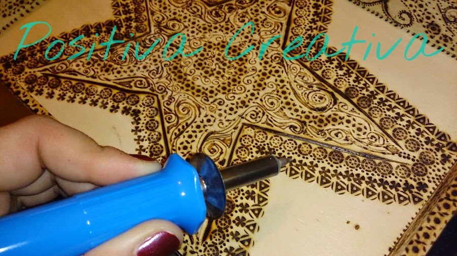 2º Ahora hay toca crear, imaginar, copiar una imagen o impresión que nos guste. Y hay que seguir el patrón con el pirógrafo. Como el pirógrafo tiene diferentes cabezas (formas), podéis ir cambiándolas y así queda más personalizado.