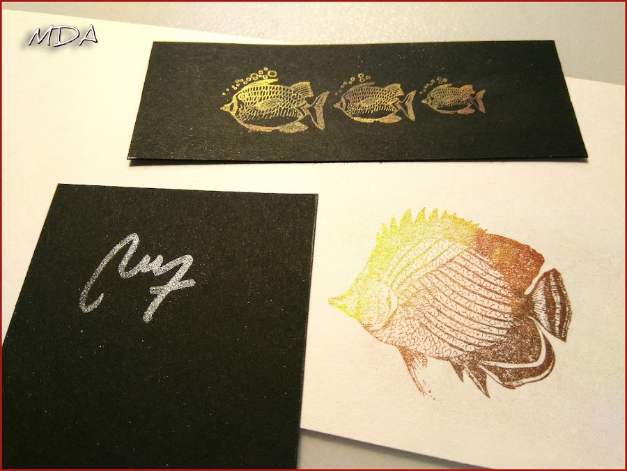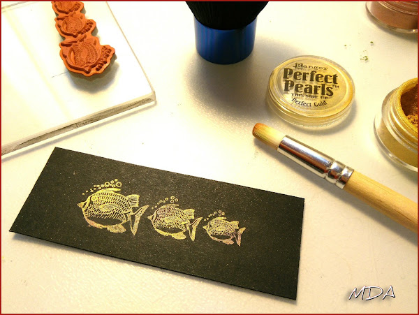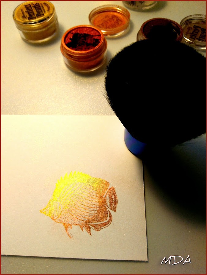 También podemos hacerlo sobre cartulinas oscuras, el color de estas marcará los colores que utilices de Perfect Pearls.