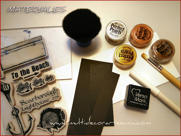 Cartulinas, sellos, pincel suave, brocha muy suave, tinta medium y Perfect Pearls.