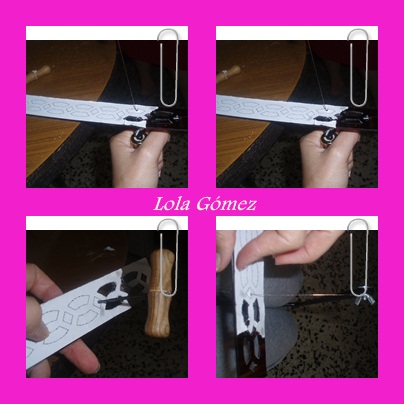 Paso 3: Seguimos cortando. Para cortar los dibujos interiores precisamos la lezna o el trompo pequeño. Para esto hacemos un agujerito en el centro del motivo por el que pasaremos el pelo de cortar. En la viñeta tres tenéis la lezna y dando vueltas hacemos el agujerito. Una vez hecho, aflojamos la palometa superior de la segueta y soltamos el pelo solo de ese lado. Lo metemos por el agujerito que hemos hecho y volvemos a atornillar el pelo. Y a cortar.