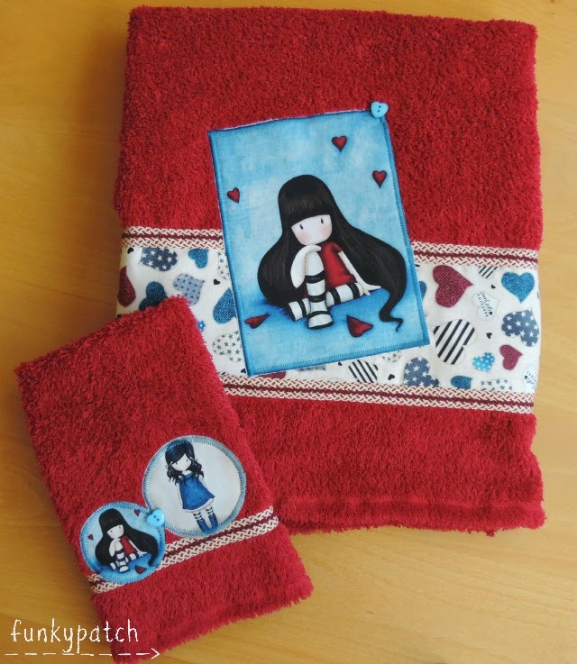 En la toalla de cortesía he cosido la misma cinta decorativa y luego de otra tela Gorjuss he cortado 2 círculos de tamaños diferente y los he aplicado con una costura zigzag.