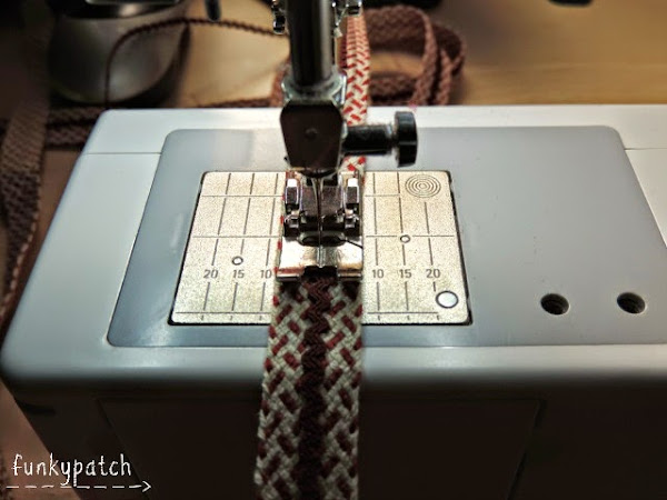 Ahora preparamos la cinta decorativa. Como no encontraba ninguna que me gustase, he decido crear la mía, así que he cosido la picunela en el medio de la cinta decorativa. Lo he hecho sin hilvanar ni sujetando con alfileres, he ido guiándome por las marcas de la maquina de coser. He visto que hay un pegamento hidrosoluble para telas con punta estrecha que me hubiese venido de lujo para esto.