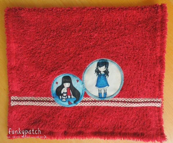 En la toalla de cortesía he cosido la misma cinta decorativa y luego de otra tela Gorjuss he cortado 2 círculos de tamaños diferente y los he aplicado con una costura zigzag.