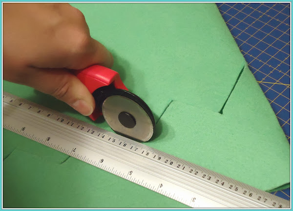 4. Cortar con el cutter y un regla por las líneas marcadas. Tened cuidado que la regla cubra la zona de la corona, por si nos salimos sea hacia afuera y no estropear el fieltro que usaremos para la corona.