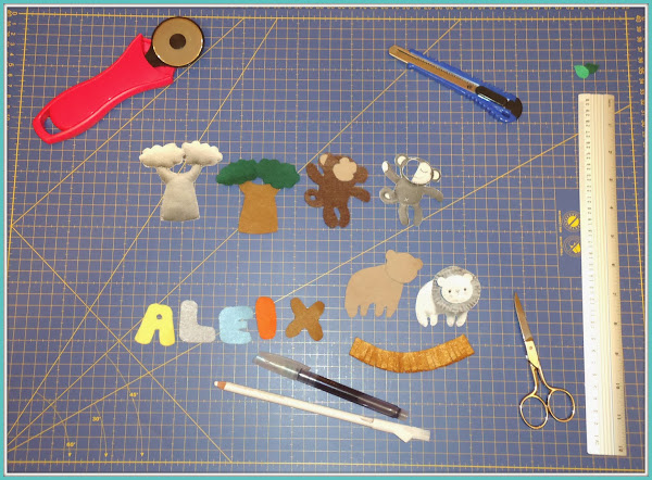 6. Recortar todas las figuras que querremos coser en la corona. Seguiremos la misma técnica, calcar el patrón sobre el fieltro y repasar con el bolígrafo al agua o con el lápiz blanco, para tejidos oscuros. Los ojos, nariz, etc se pueden hacer cosiendo con un hilo más grueso (como el de bordar) o con pintura para tela.