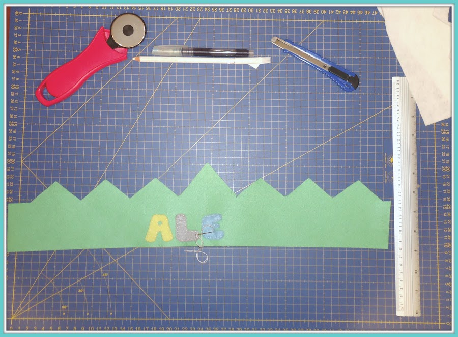 7. Coser las figuras a la corona. Yo siempre empiezo con el nombre, intentando que esté lo más centrado posible. A partir de allí coso el resto de figuras así como me guste más.