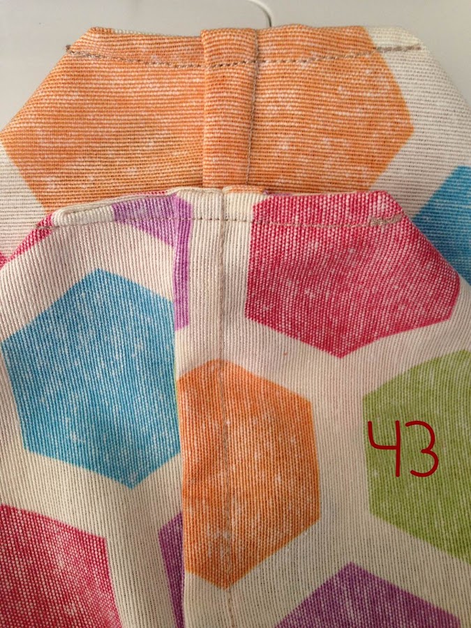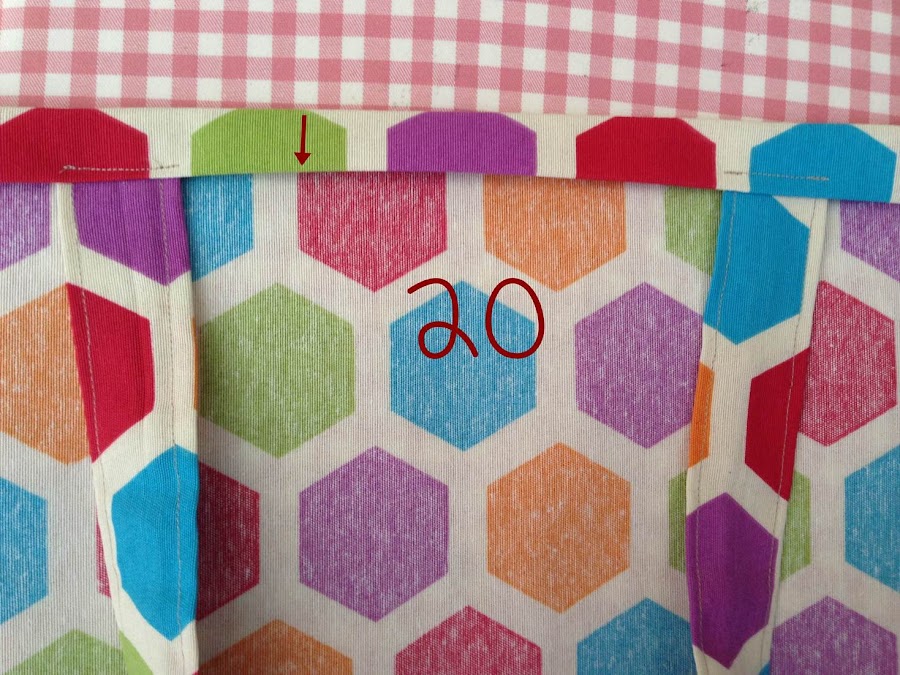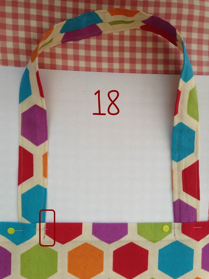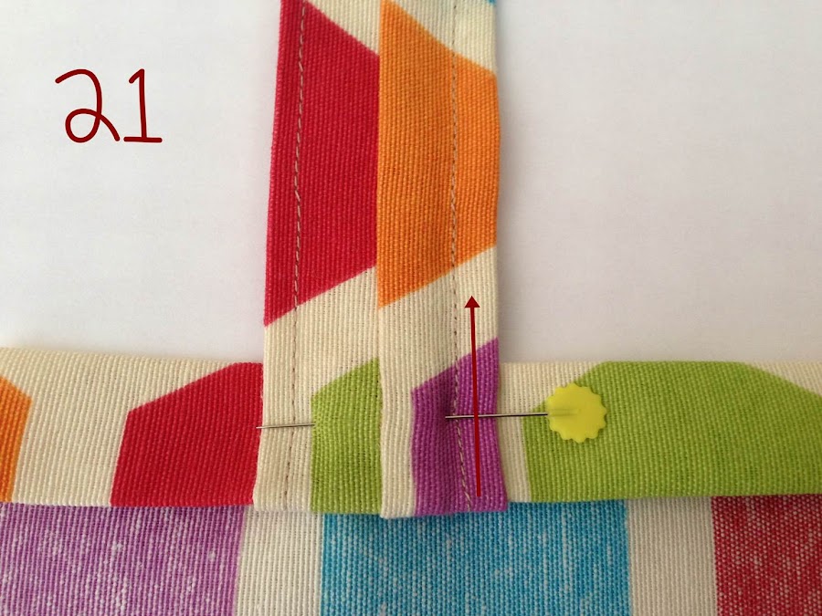 21. Lleva las asas hacia arriba y asegura con alfileres, ¿ves cómo queda la costura central sobre la trasera de la tela?