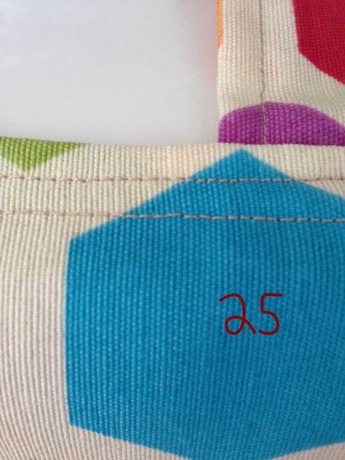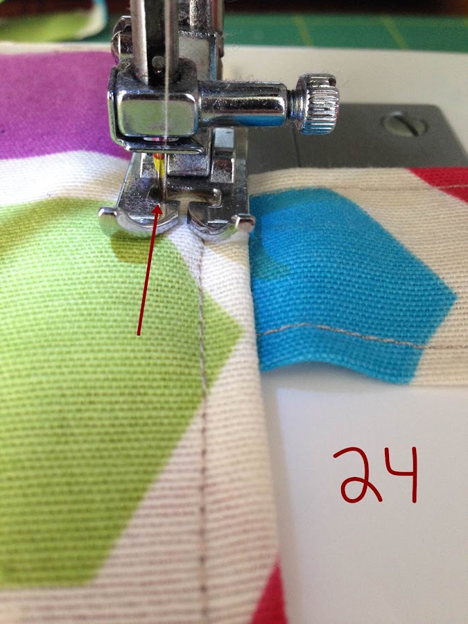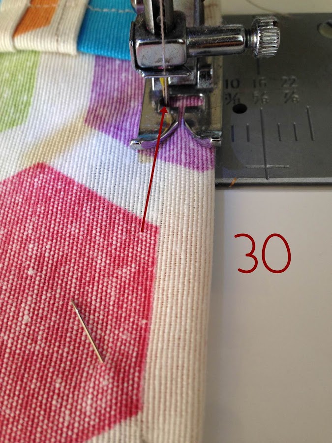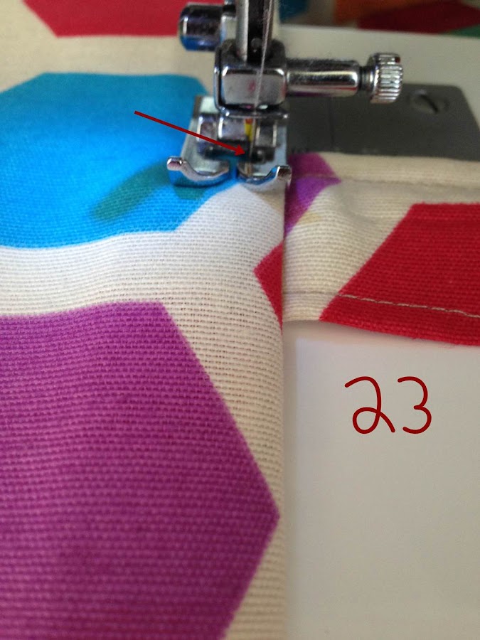 23. Coloca la tela con la parte bonita hacia arriba, pon tu aguja a la derecha del todo y guíate por el pie de máquina para hacer una costura de un lado al otro, así reforzamos también el asa.