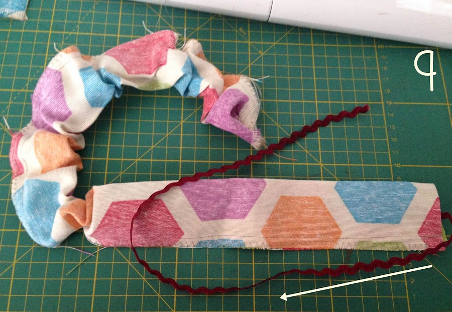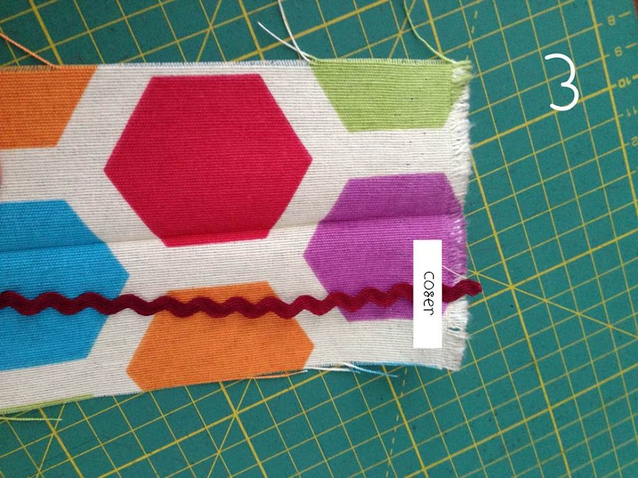 3. Abre la tira y coloca la cinta en uno de los lados de la tira y pasa un pespunte cerca del borde para asegurarla