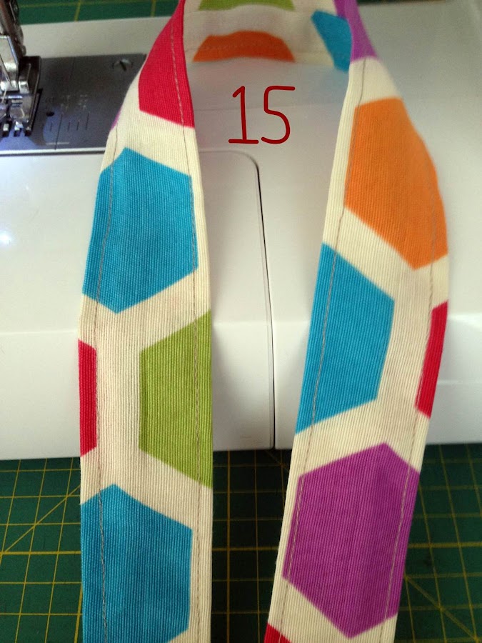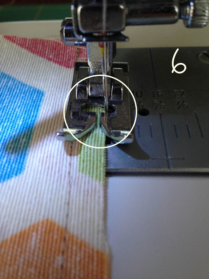 13. Para asegurar el asa, vuelve a coserla con puntada recta, llevando la aguja a la derecha del todo para que la costura quede pegadita al borde. Cuando tengas más práctica podrás hacerla mucho más cerca sin necesidad de guiarte por el pie de máquina...